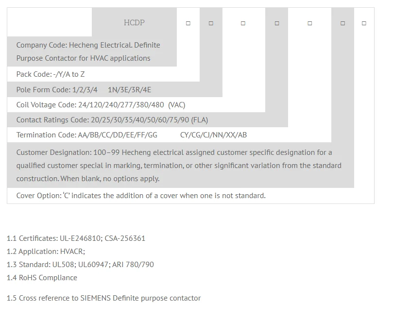 Definite purpose contactors are utilized in a variety of industrial electric equipment, these include heating, ventilating, air conditioning, refrigeration, food processing, and agricultural, in addition to numerous other applications. All definite purpose components meet industry standards including ARI780, UL, CSA, and CE.